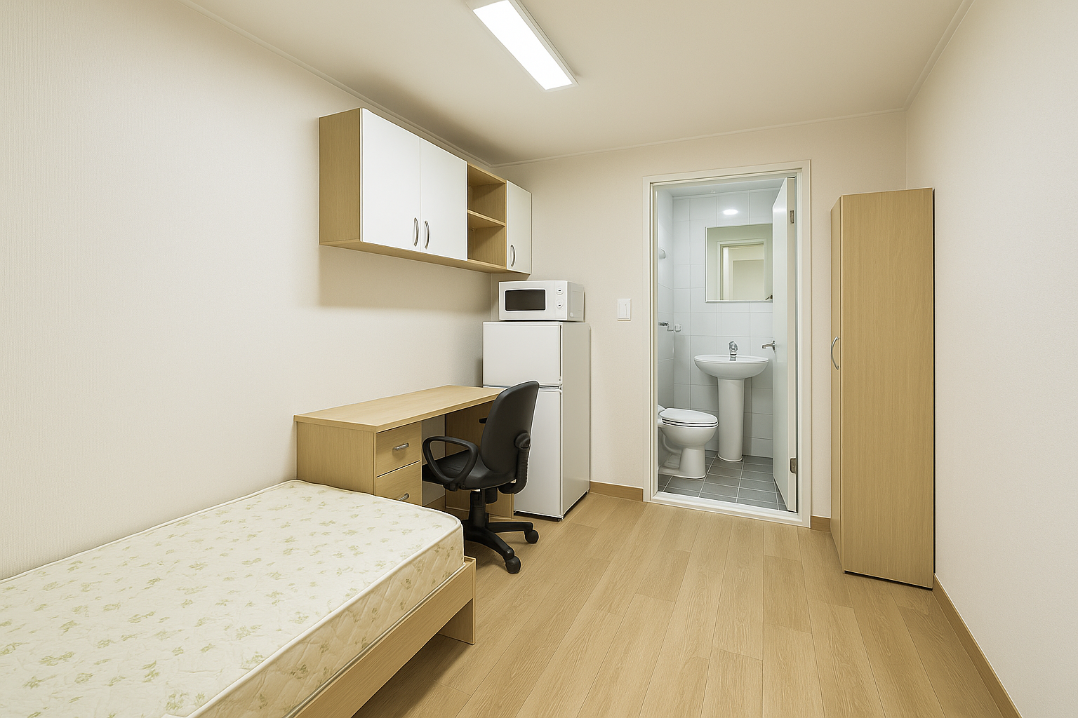 - 공용 시설 중심: 대부분의 고시원은 방 안에 화장실이 없으며, 샤워실, 화장실, 주방, 세탁실을 공동으로 사용합니다.