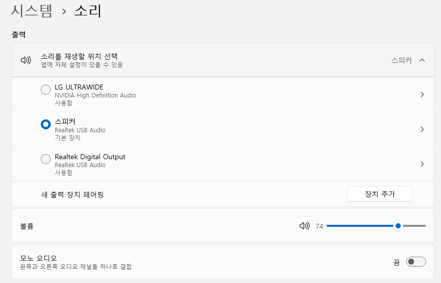 - 출력 장치를 ‘스피커(Realtek High Definition(또는 USB) Audio)’로 변경합니다.